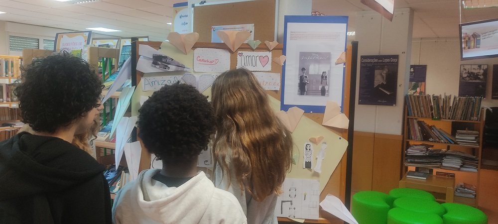 A turma do 7.º C participou numa atividade dinamizada pela professora Bibliotecária, Ana Escudeiro, no dia 13 de fevereiro, para comemorar a Semana dos Afetos. Acompanhados pela professora Isabel Rodrigues, vimos uma curta-metragem intitulada “Paperman” – “O rapaz de papel” e depois falámos sobre as ideias principais do filme. De seguida, visitámos uma exposição de livros e filmes que abordavam o tema dos afetos e realizámos vários trabalhos manuais relacionados com a curta-metragem, construindo um Mural dos Afetos que está exposto na biblioteca. Todos contribuímos para o mural: uns escreveram palavras-chave, outros fizeram origami, outros desenhos e aviões de papel. Foi uma atividade divertida que nos permitiu dar asas à imaginação.